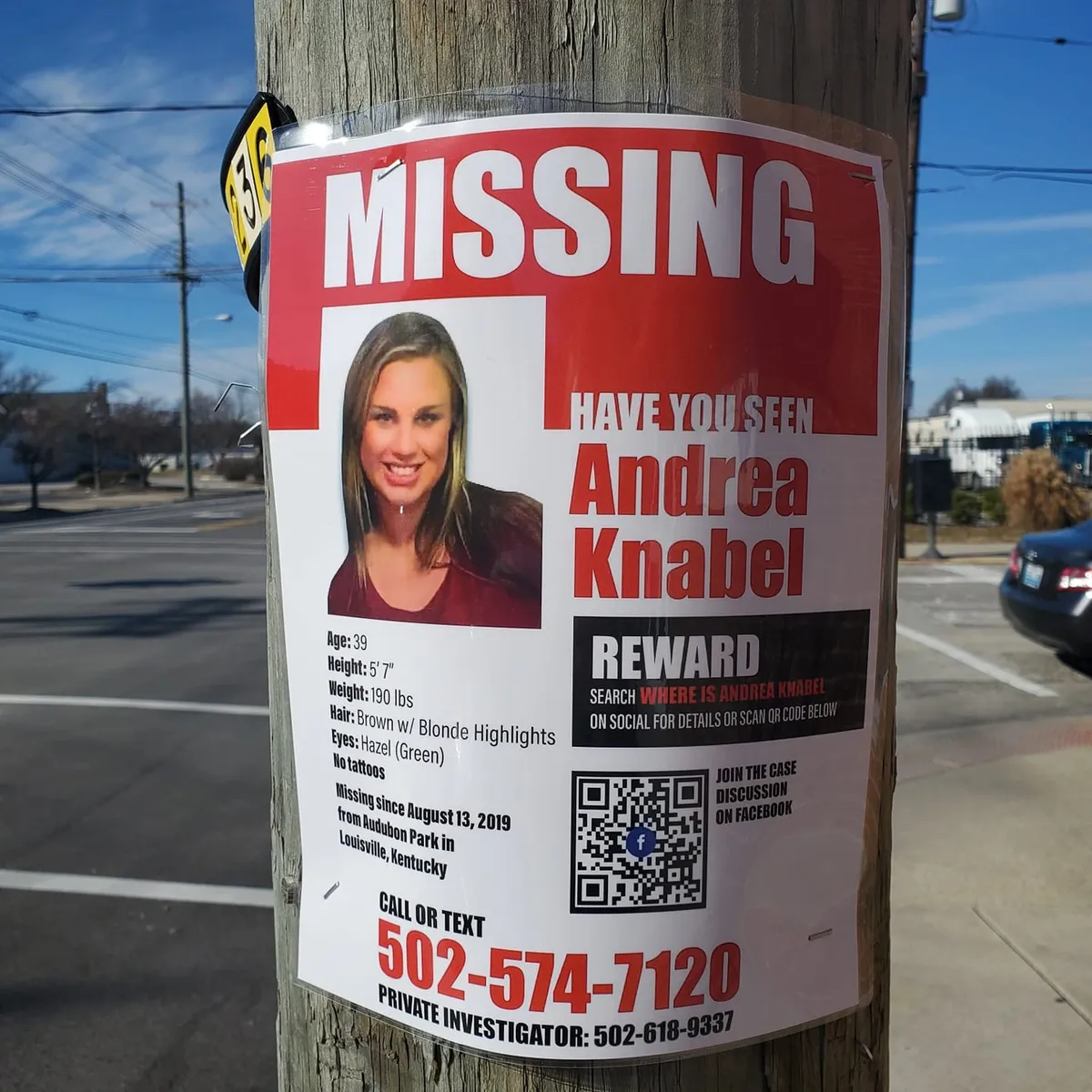 If you have any information about the disappearance of Andrea Knabel, please contact the Louisville Metro Police Department at (502) 574‑7111 or private investigator Tracy Leonard at (502) 618‑9337.