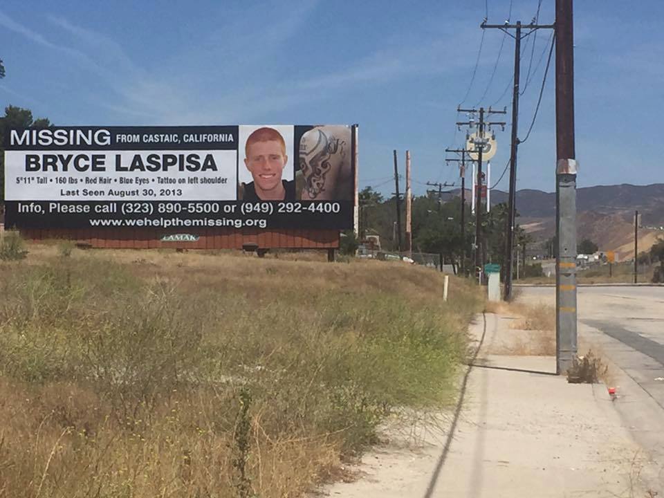 Bryce Laspisa was 19 years old when he disappeared from the vicinity of Castaic Lake on August 30, 2013. He had spent the preceding days exhibiting uncharacteristic behavior, including sitting in his parked car for nearly 13 hours in Buttonwillow despite being only a few hours from his destination.