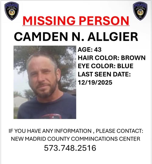 Camden Allgier, 43, has been missing from New Madrid, Missouri since December 19, 2025. He was last seen at his residence in the 700 block of Mott Street, where a relative spoke with him that day.
