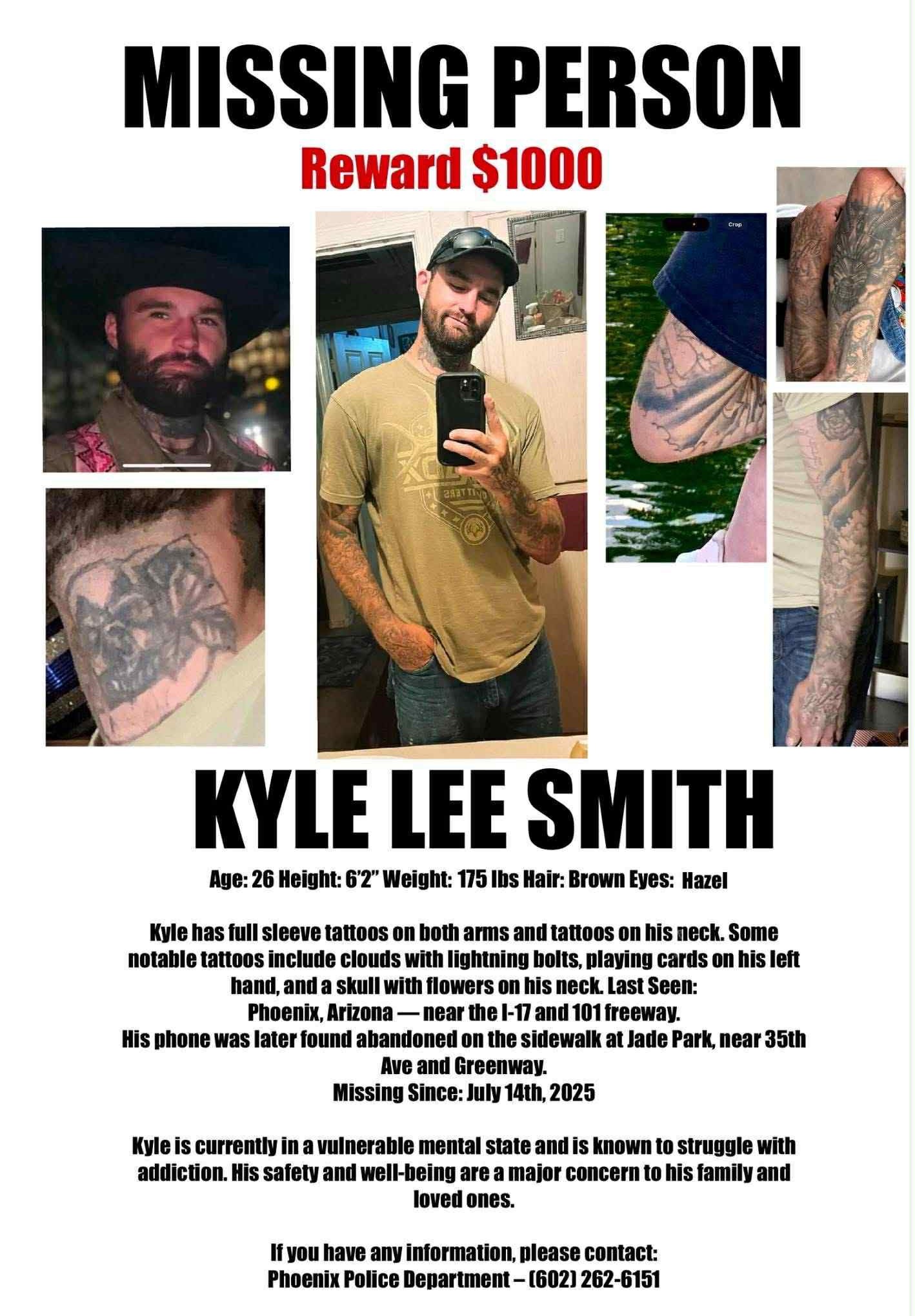 If you have any information regarding the disappearance of Kyle Smith or witnessed unusual activity at Country Gables Park on the night of July 14, 2025, please contact the Phoenix Police Department at 602-262-6151. Please reference case number 202501056427 when providing your tip.