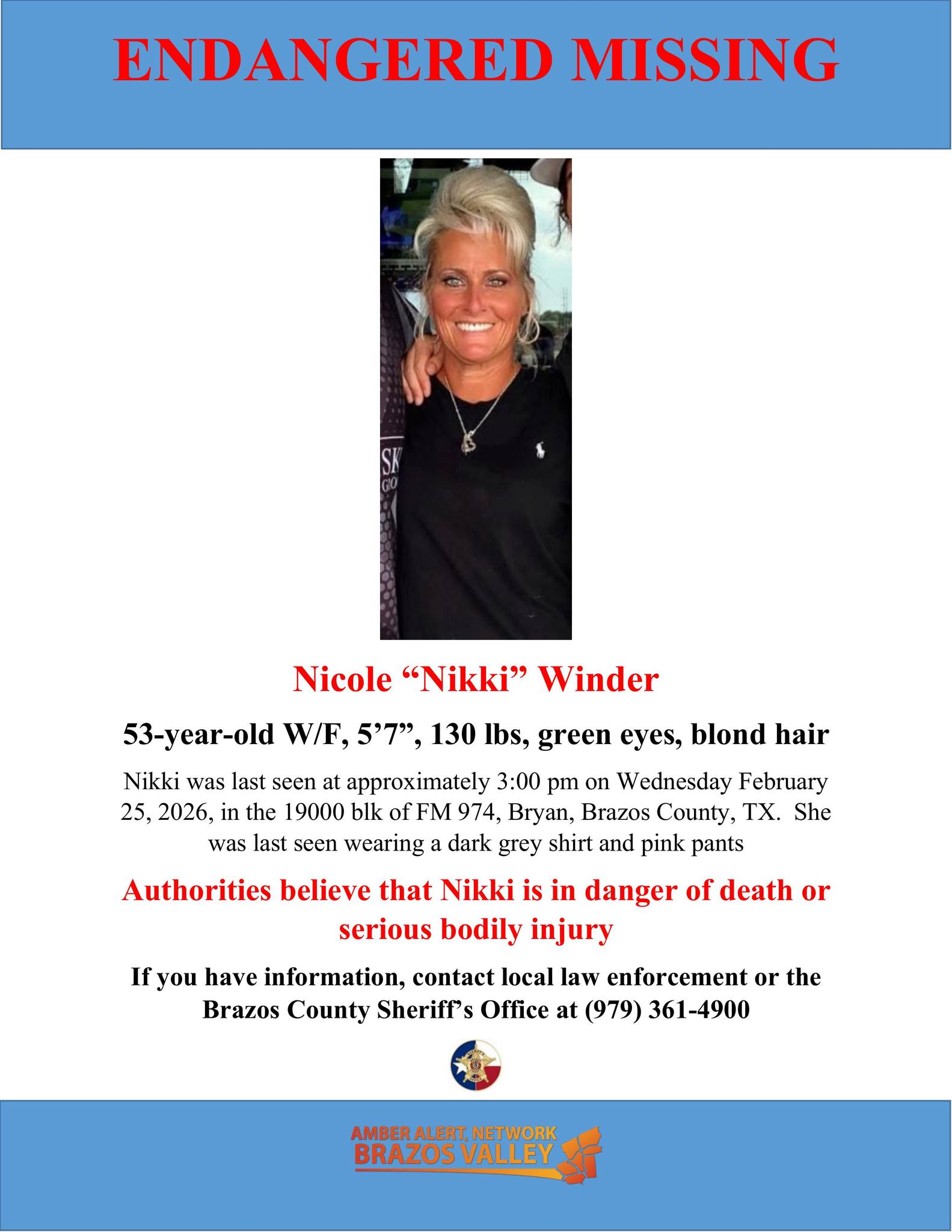 Nicole “Nikki” Winder is 53 years old and disappeared from Brazos County, Texas. Specifically, she went missing at about 3:00 p.m. on February 25, 2026. At that time, she was leaving a home where she worked on FM 974. Furthermore, no one has heard from her since that afternoon.